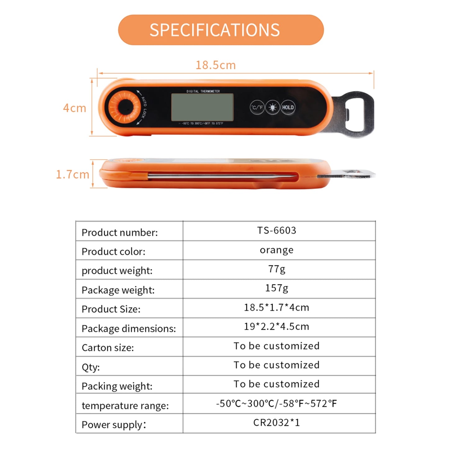 Safety In Use & Application: With a foldable 304 stainless steel probe,high sensitivity sensor is at the head of stainless,size is more slimer.which enable to feedback the temperature faster and accurater. the cooking thermometer can be easily inserted into food or liquid and maintain the temperature. There is no longer a danger of hot hands! When you are making sweets, BBQ, Baking, baby milk, tea, coffee, turkey, frying, food thermometers can let you quickly read the temperature of the food.